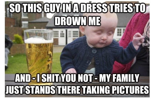 This guy in a dress tries to drown me and everyone just takes pictures, add it to the list for the psychiatrist when you get a bit older kid